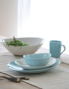 Contempo Dinnerware Collection. Available in 3 spring colors: turquoise, ivory and lime. Ceramic dinnerware made from natural clay and sealed with a food safe and earth friendly glaze. All of the paints and dyes used in the coloring process are milk based. Each piece is strong and durable for a long lasting dinnerware collection. reg. $8.95 – $162.95