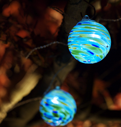 Aurora Glow String Lights. Totally sustainable, hang beautiful Aurora Glow string lights once and enjoy their artisan glow every night! Illuminate your outdoor spaces with beautiful and festive solar powered hand-blown glass string lights. Six lights crafted from colored and clear hand-blown glass and luminescent details adorn a clear wire and come complete with six high powered LED lights and copper hanging hooks. Aurora Glow string lights are powered by the sun, with a solar panel located nearly 15 feet away from the first glass globe. Plant or mount the solar collector away from the lights and enjoy the glow at night while collecting the maximum amount of sunlight during the day. reg $57.00