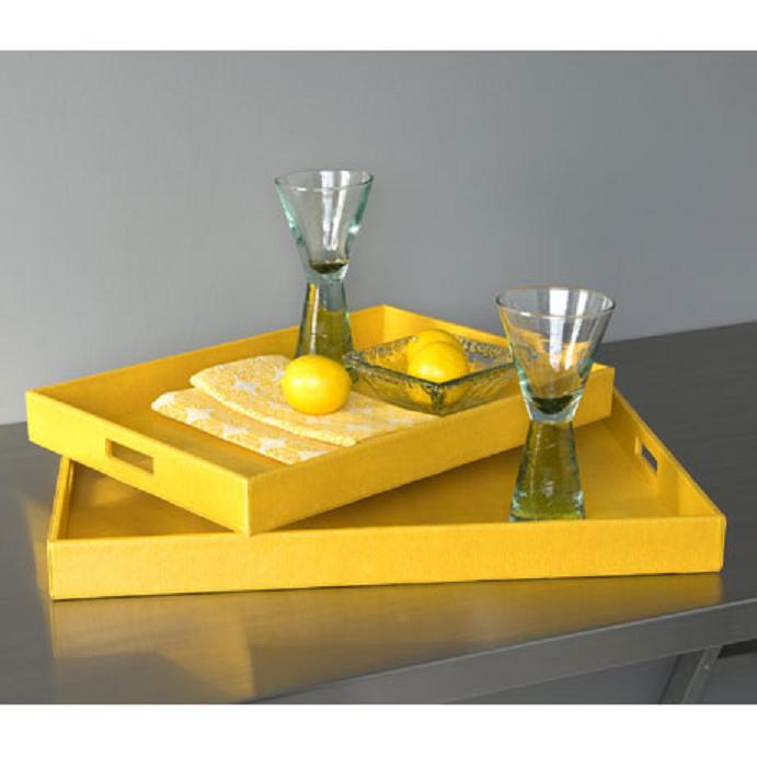 Soleil Serving Trays. These Soleil Servings Trays are bold and striking with bright colors and made from 100% recycled material. The trays are finished with 100% biodegradable polyurethane, giving them the feel of leather covering and protection for added water proofing. reg. $39.00 – $82.00