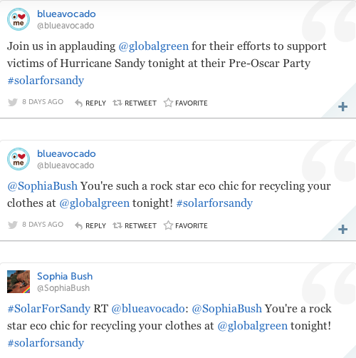 We began our Twitter campaign by wishing Global Green good luck on their event and began engaging with them as the host. During the event, we shortened Facebook posts to leverage on Twitter as well. I also had my team live tweeting and monitoring Twitter for appearances of the hashtag for the event (#solarforsandy). As you can see, we hit twitter gold with this exchange. Note to self: Calling someone a rock star eco chick is liable to get you retweeted!